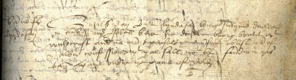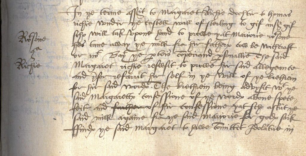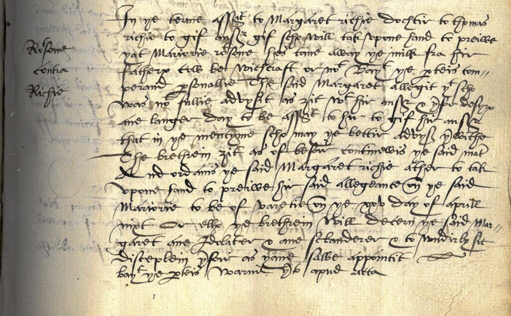 Another early case appears in the Stirling Presbytery records. Local church courts were often the first place an accused witch would appear to justify their actions. On 13 April 1587, Margaret Ritchie was brought before the Presbytery to prove that Marjorie Robertsone had taken milk from her father’s cow through witchcraft. Margaret stated that she was “nocht yet fullie advysit…with hir answer” and requested more time. The Presbytery agreed to reconvene on 15 April to determine whether the accusation was true or slander.