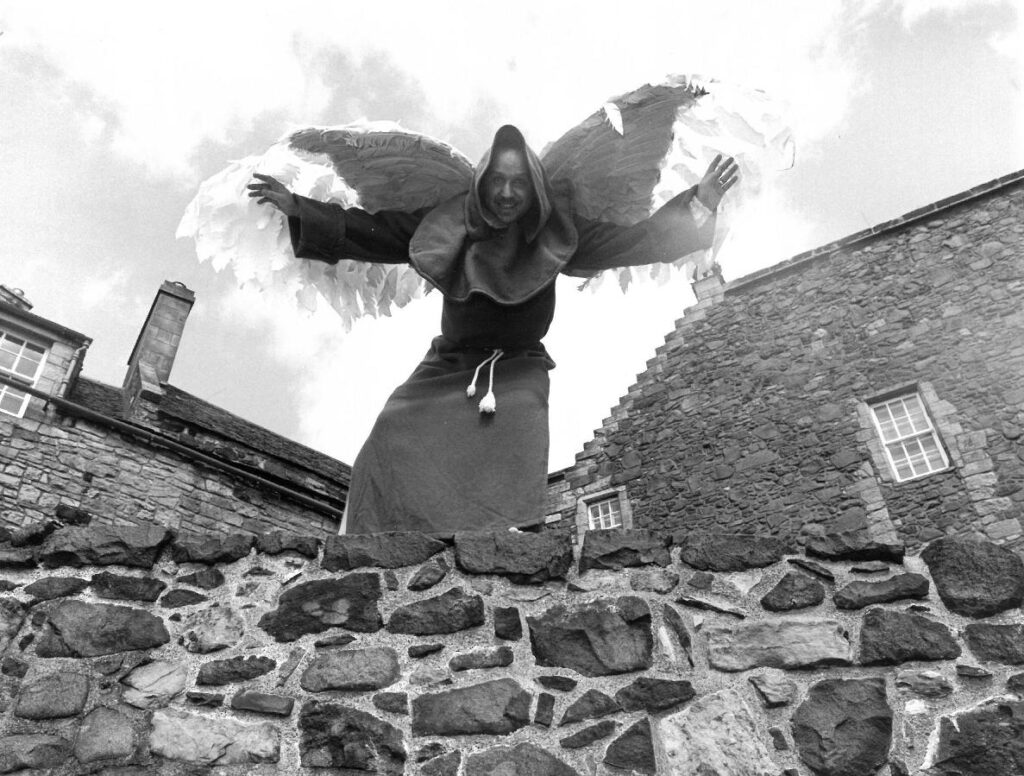 These two photographs were taken to promote the play dramatising the attempt made by John Damian de Falcuis, an alchemist and member of the court of James IV at Stirling, to achieve man-powered flight. In 1507, Damian fashioned himself a pair of wings using canvas and feathers and tried to ‘fly’ off Stirling Castle battlements. Fortunately for him, he survived the experiment due to landing in a pile of refuse below the Castle walls.