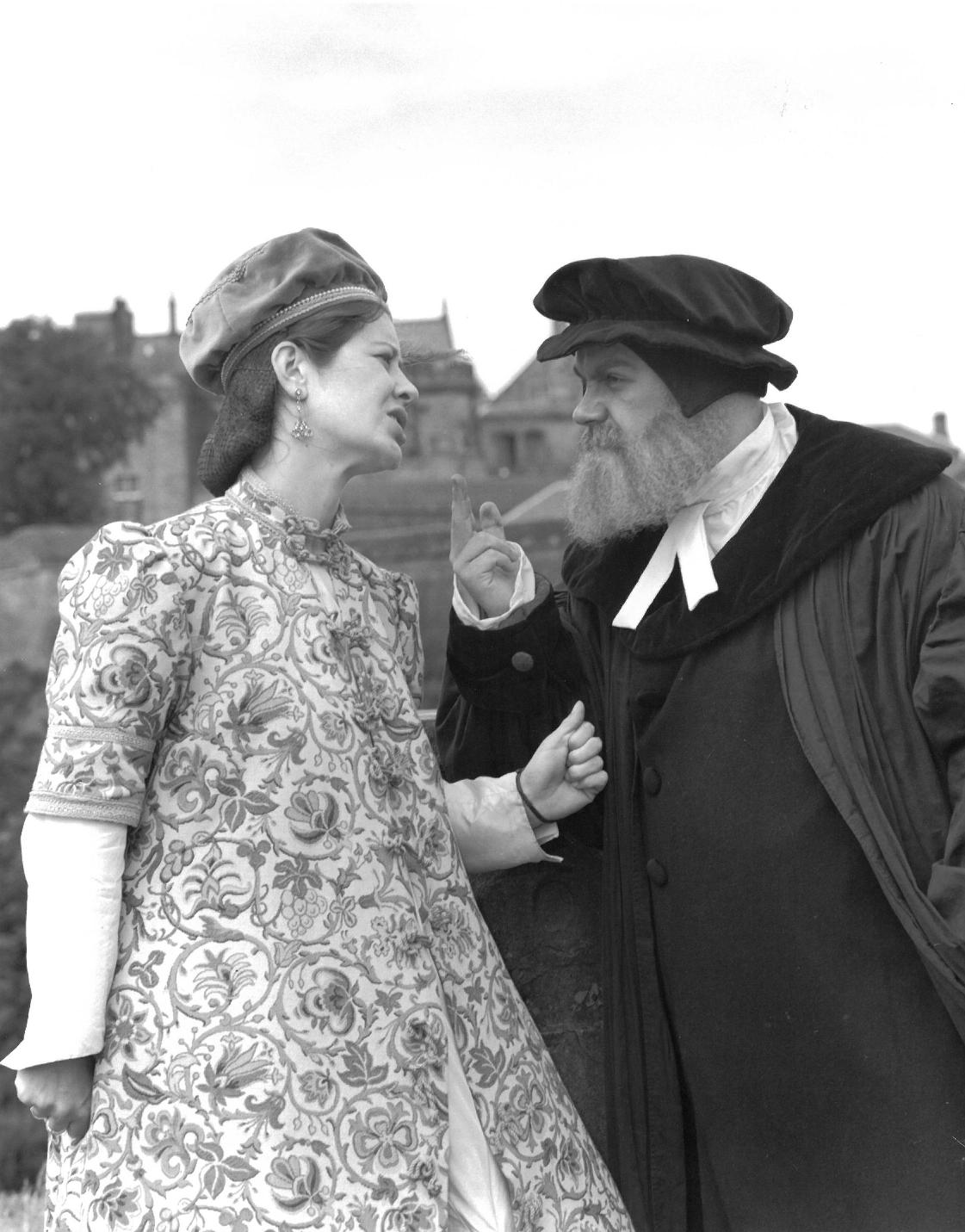 These images were taken to publicise the play about the relationship between the Reformation Minister John Knox and Mary Queen of Scots. Knox was the author of the book The first blast of the trumpet against the monstrous regiment of women, published in 1558. He was summoned by Queen Mary several times in the 1560s for interviews that were reported to have been somewhat acrimonious.